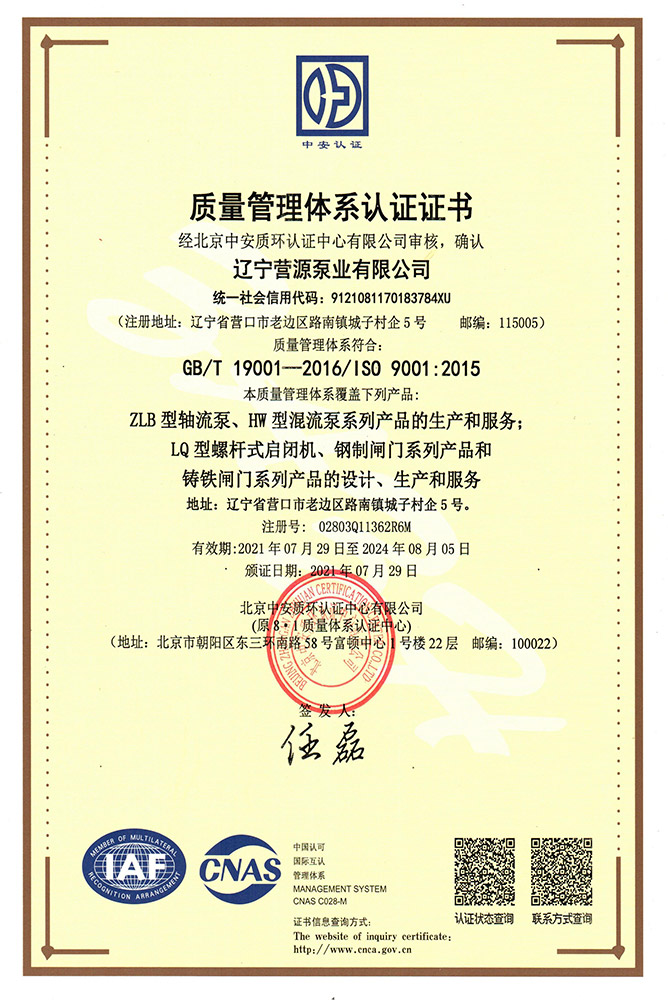 遼寧營源泵業(yè)有限公司始建于1995年,位于渤海之濱、遼河岸畔,東臨沈大高速公路、南靠營口鲅魚圈新港、北臨京沈高速公路,公司距營口高鐵站15公里距營口機場20公里,地理位置優(yōu)越,海陸空交通極為方便。公司主導產品是各種規(guī)格農業(yè)水利及市政排污用軸流泵、混流泵、潛水軸流泵、漂浮式軸流泵、移動式泵站、集裝箱式泵站、QJ系列井用潛水電泵、螺桿式啟閉機、固定卷揚式啟閉機、平面鑄鐵閘門、中型鋼制閘門、GGD-YY型交流低壓配電柜。